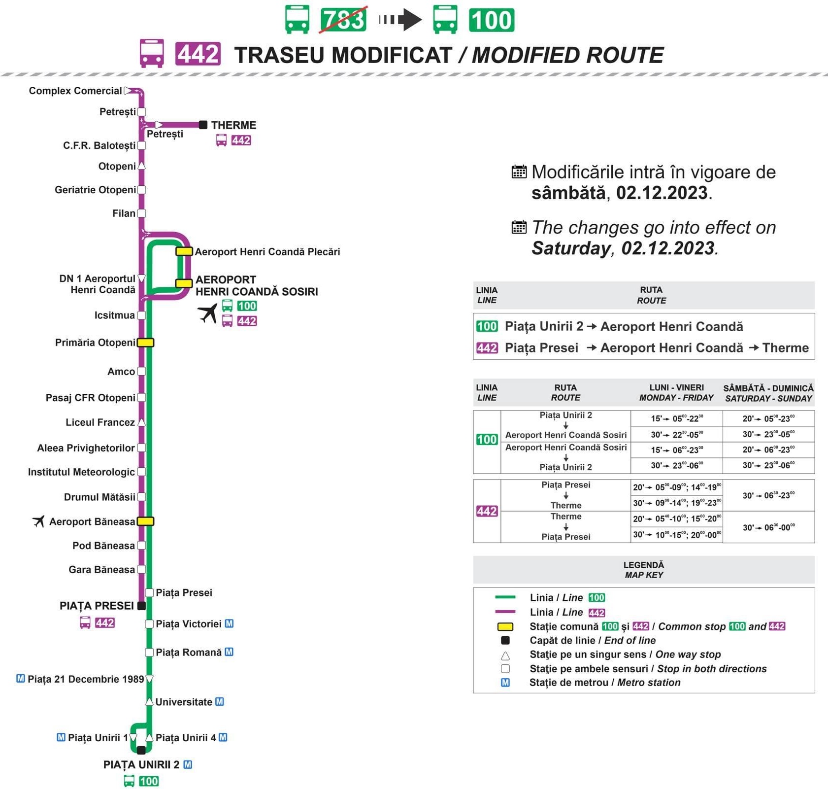 以前は「783番」として空港と市内をつないでいたバスが「100番・急行バス(100Express Line)」となっています。終点は「ピアツァ・ウニリイ(ウニリイ広場/Piața Unirii)」。ブカレスト中心部にある、ヨーロッパ最大級の広場です。